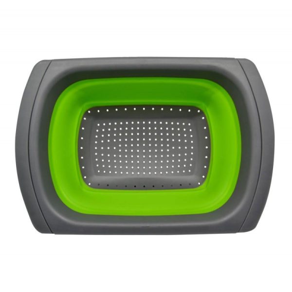 Σουρωτήρι από σιλικόνη σε λαχανί χρώμα με γκρι επεκτεινόμενες πλαστικές λαβές. Είναι αναδιπλούμενο για εύκολη αποθήκευση.